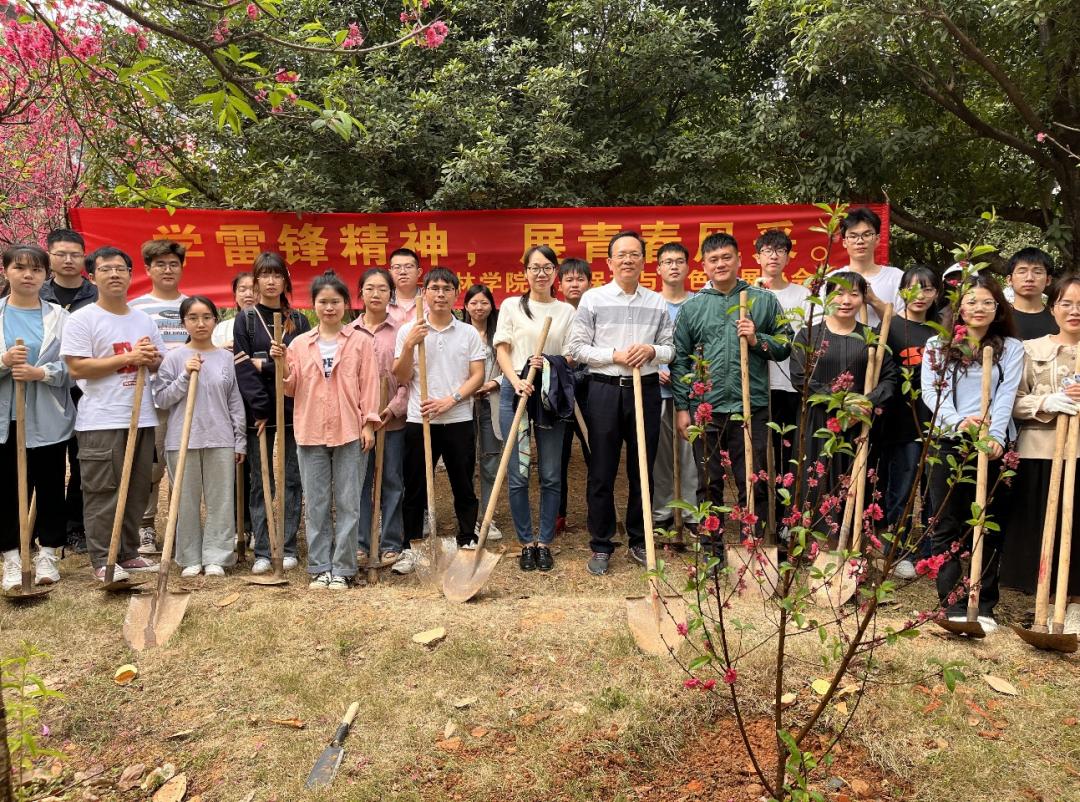 在员工林植树现场,员工代表与广西国有大桂山林场吴秦展副场长公司师生三十余名,共同种下十棵象征绿色希望的桃花幼苗,为西大的春天增添了一抹亮色。活动伊始,和太平教授鼓励同学们参与校园绿化活动,把义务植树作为一种文化传承,当作一份责任担当,强化师生爱绿、护绿、植绿的生态文明意识,珍惜发展成果,努力做生态文明建设的实践者、推动者。随后,员工广西国有大桂山林场吴秦展副场长表示,本次活动为广大同学提供了参与生态环境建设的机会,希望同学们继续牢固树立绿水青山就是金山银山理念,为广西乃至全国的林业建设作出贡献。