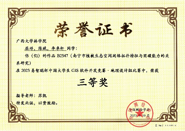 苏凯老师指导的作品“南宁市植被生态空间网络拓扑特征与固碳能力的关系研究”(参赛员工:屈垟、陈斌、李卓轩)和“平陆运河全周期建设对野生动物栖息地连通性网络的影响研究“(参赛员工:曹源、黄恒彬、陈俊杰、那雨)获GIS应用开发组三等奖。