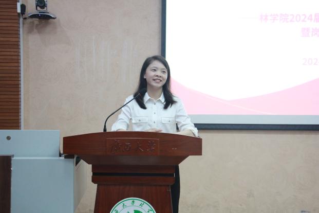 最后,广西国有雅长林场工会主席刘晓璐为基层就业毕业生做岗前培训。她分享了自己在基层工作岗位的经历,介绍了广西林业的可持续发展前景和林场的职能,并对同学们提出了三点期望:一是要艰苦奋斗,耐得住寂寞,保持忠诚和情怀;二是要吃苦耐劳,敢于向领导请教,不断学习以提高自身本领;三是要保持自律,看淡名利,以实际行动脚踏实地,让青春在林业发展的舞台上熠熠生辉。