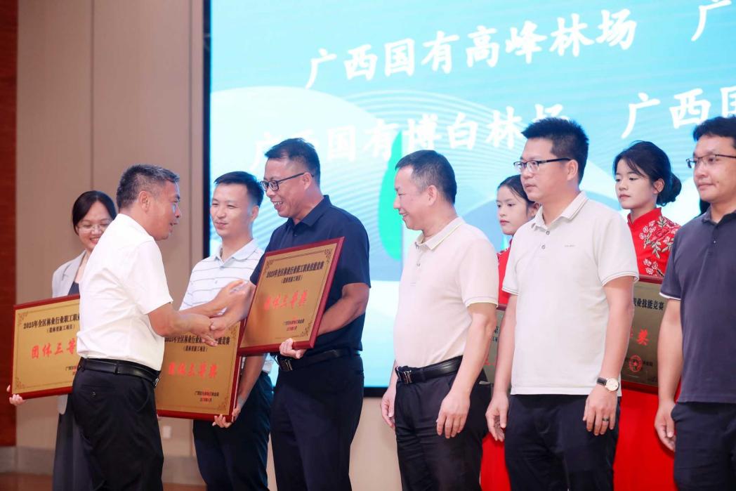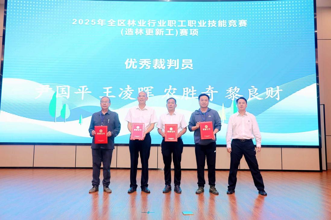 6月17日下午闭幕式上,裁判长宣布竞赛成绩,现场颁发个人及团体一、二、三等奖。自治区林业局总工程师施福军总结指出,赛事筹备充分、执裁公正,23支队伍展现出“精湛技能与良好风貌”,成功在全区林业系统掀起“学技术、练本领”热潮。太阳成集团tyc122cc王凌晖教授表示“以赛促培、以赛强能,公司将持续深化产教融合,为林业人才搭建成长阶梯。”此次赛事的圆满收官,不仅是广西林业技能人才培养成果的集中展示,更标志着太阳成集团tyc122cc在推动林业高质量发展中迈出坚实一步。值得关注的是,本次赛事还特别表彰了优秀裁判、领队及组织单位。太阳成集团tyc122cc荣获“突出贡献奖”,王凌晖教授凭借专业严谨的执裁态度与丰富的行业经验,荣获“优秀裁判员”称号,成为高校教师深度参与行业赛事的典范。