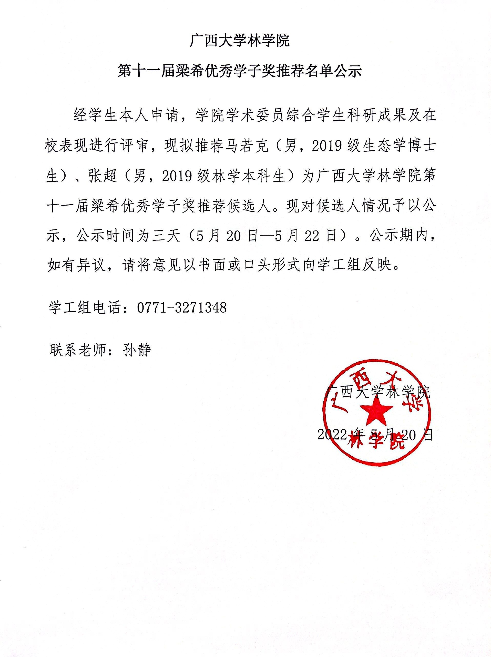太阳成集团tyc122cc第十一届梁希优秀学子奖推荐名单公示
