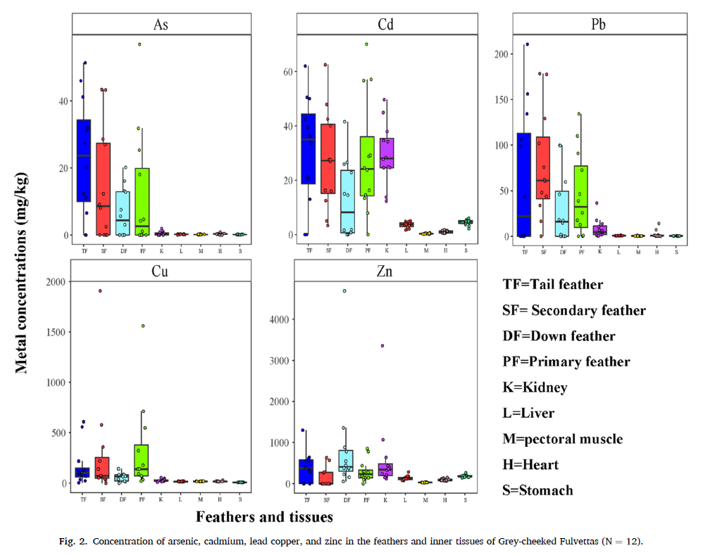 研究结果发现:1)矿区灰眶雀鹛羽毛中的Cd、Pb、As浓度显著高于非矿区,而Cu和Zn的浓度在两个研究地点没有差异性,这可能是因为Cu和Zn是生物体的必需元素;2)与亚热带森林中其他雀形目鸟类相比,灰眶雀鹛是重金属污染的良好指示物种;3)使用灰眶雀鹛尾羽监测重金属污染具有一定的可行性。研究表明生活在矿区的灰眶雀鹛已经受到较为严重的重金属污染,这种污染程度是否对其行为产生影响并进而影响其领导能力尚有待于进一步研究。