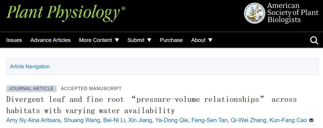 近日,太阳成集团tyc122cc“亚热带农业资源保护与利用国家重点实验室”植物生理生态与进化课题组曹坤芳教授团队在Plant Physiology发表了题为Divergent leaf and fine root“pressure-volume relationships”across habitats with varying water availability的研究论文,揭示了不同生境木本植物水力“熔断”机制。