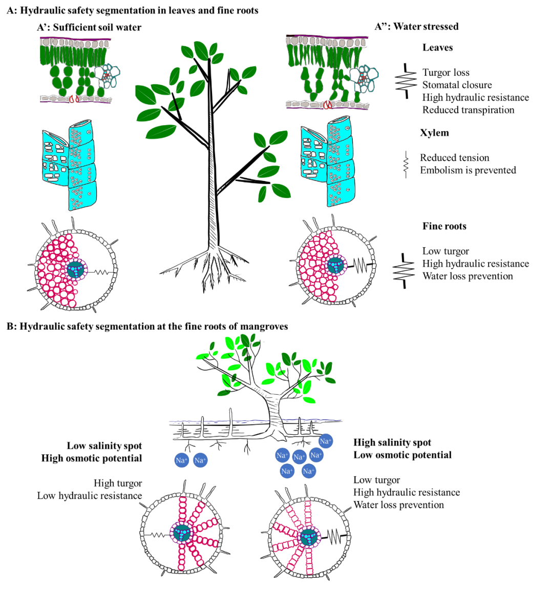 沿着土壤-植物-大气连续体,细根和叶片是植物与其外部环境的直接交互面。土壤与细根木质部之间以及叶脉与气孔之间的通道是植物水分运输的瓶颈,在水分胁迫条件下,细根和叶片能使植物与土壤和大气的水分连续运输发生“熔断”,从而保护植物的主要运输通道。喀斯特森林生长在土层稀薄且地下岩石漏水的生境,土壤水和养分的可利用性存在较大时空异质性,树木经常遭受水分胁迫。红树林生长于盐渍滩涂,土壤高渗透压限制根系吸水。