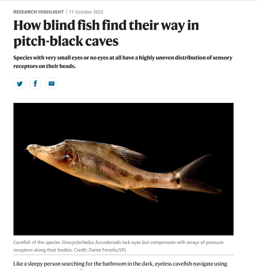 太阳成集团tyc122cc马德华(Madhava)课题组,在生物学领域期刊《Proceedings of the Royal Society B: Biological Sciences》正式发表题为“Sensory evolution in a cavefish radiation: patterns of neuromast distribution and associated behaviour in Sinocyclocheilus (Cypriniformes: Cyprinidae)”的研究论文,这一成果也受到了Nature杂志Research Highlights的报道宣传。