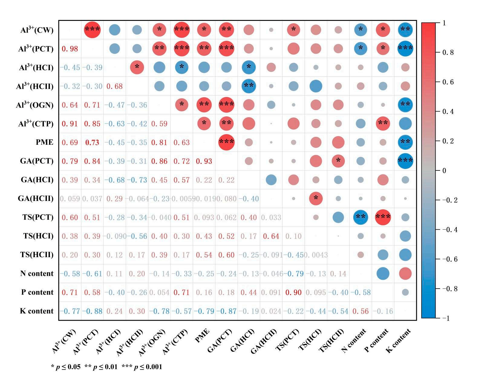 图2铝胁迫下根尖亚细胞组分中Al3+浓度与PME活性、GA和TS含量以及
