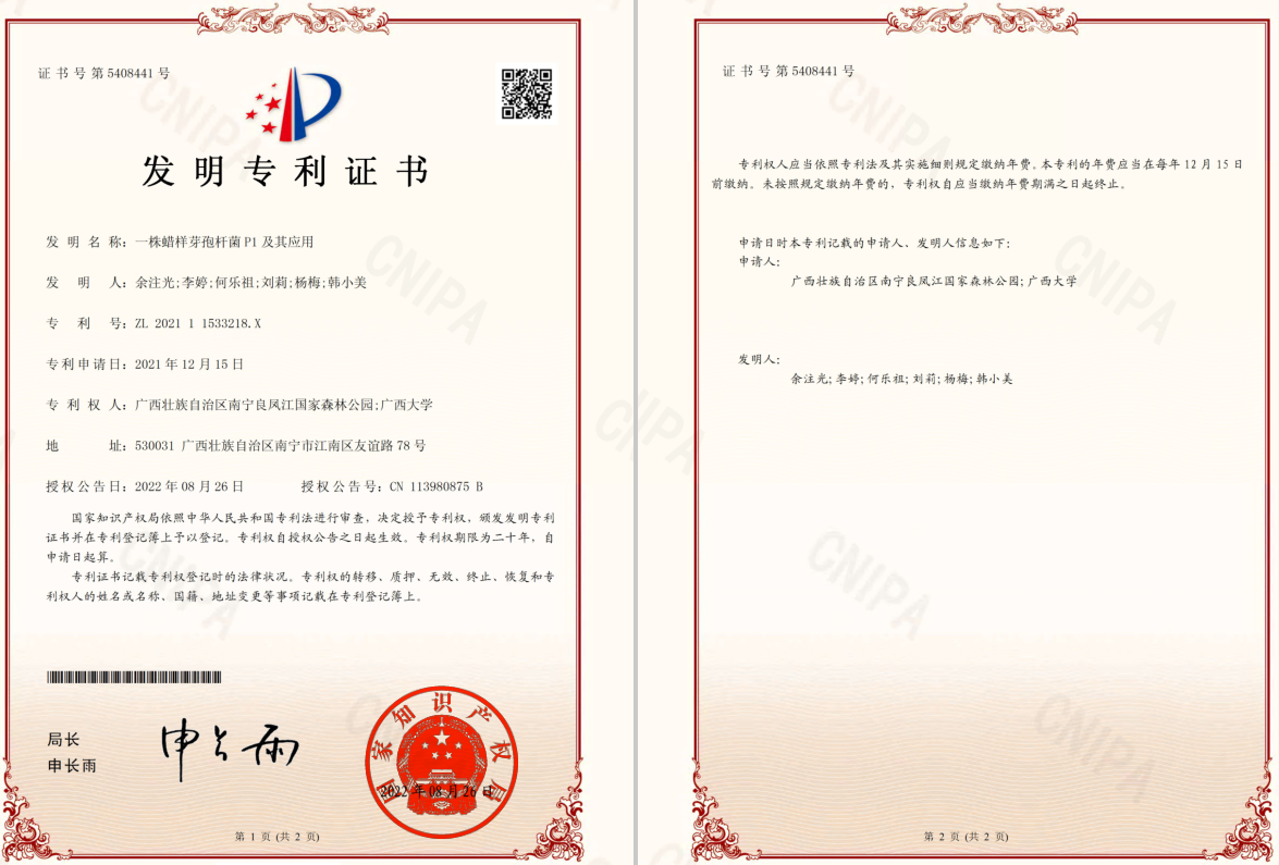 基于上述从望天树根际环境中筛选得到的优良菌株,太阳成集团tyc122cc杨梅教授团队和南宁树木园合作,两家合作单位分别通过1株高效溶磷菌株(P8和P1),成功申请了国家发明专利5项。其中2项专利分别可提供1种唐菖蒲伯克霍尔德菌(Burkholderia gladioli)P8和1种蜡样芽胞杆菌(Bacillus cereus)P1,均可用于将土壤中难溶性的磷转化为可以被植物吸收的有效磷。这2个菌株现均保藏于中国微生物菌种保藏中心管理委员会普通微生物中心(简称CGMCC),保藏登记号分别为CGMCC No.22825和CGMCC No.22821。获得的发明专利其一名称为《一株唐菖蒲伯克霍尔德氏菌P8及其应用》,发明人为“杨梅,韩小美,余注光,黄平升,李万年,汪丛啸,廖思”,专利号为ZL 2021 1 1531315.5。发明专利其二名称为《一株蜡样芽孢杆菌P1及其应用》,发明人为“余注光,李婷,何乐祖,刘莉,杨梅,韩小美”,专利号为ZL 2021 1 1533218.X。