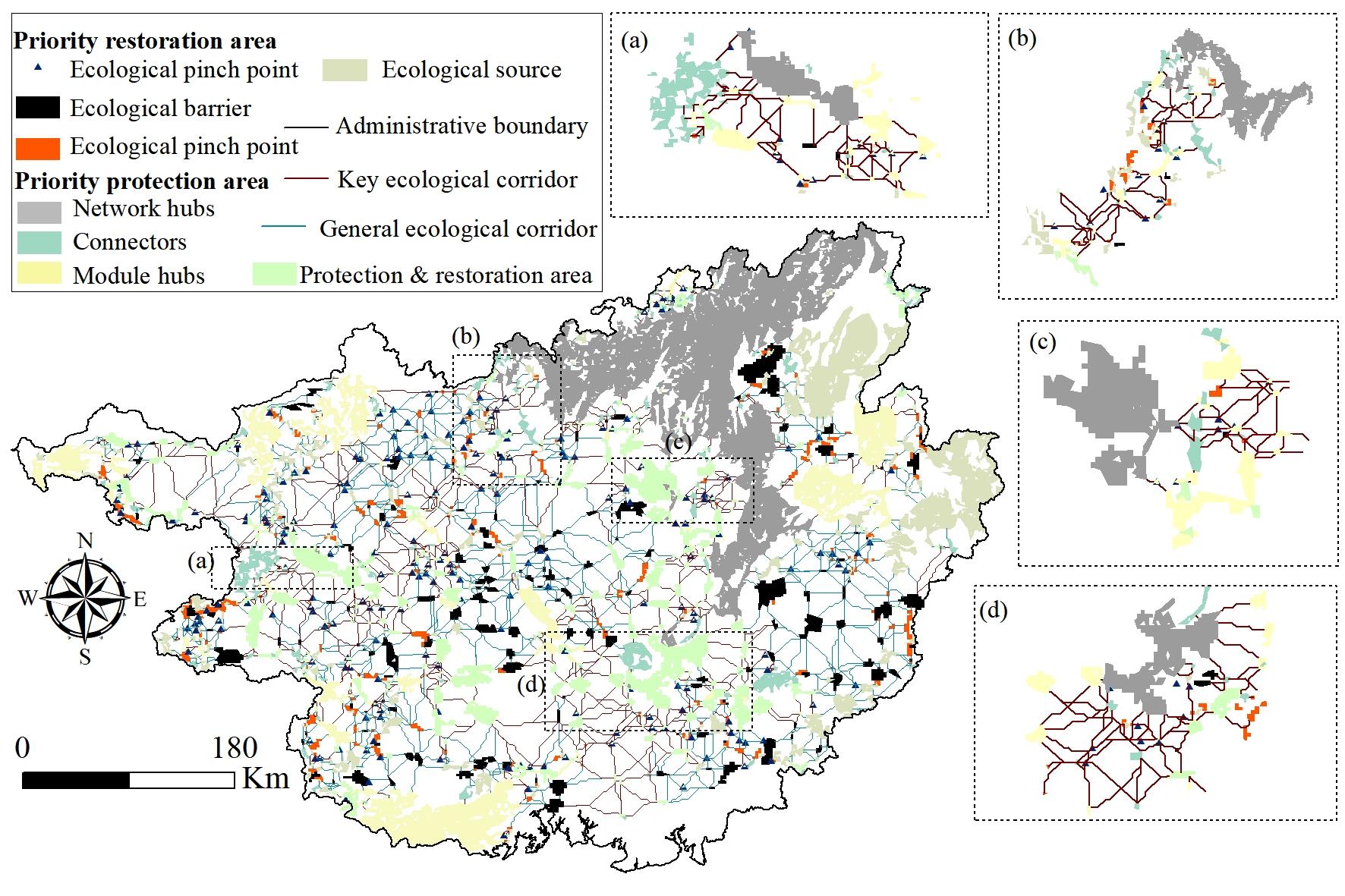 识别和保护生态资产的关键场所,改善空间连通性和可达性是保护生态多样性的重要措施。公司研究团队以广西为研究区域,基于生态系统生产总值(GEP)识别生态源,结合MCR模型构建初始生态网络。利用电路理论提取初始生态网络的内部缺陷,根据复杂网络分析确定具有明确空间位置的恢复和保护优先区域,并对优化前后的网络性能进行全面评价。结果表明:识别出456个初始生态源和1219个生态廊道,形成了广西的初始生态网络。基于电路理论,提取了168个生态屏障、83个生态夹点和71个生态垫脚石进行网络优化。优化后共有778个生态源,总面积73950.56 km2;2078条生态廊道,总长23922.07 km。优化后的结构GEP较未优化的结构提高了13.33%。保护的优先区域呈大面积集中连片分布,附带的GEP达到1180亿美元,占优化后生态源地附带总GEP的72%。恢复的优先区域呈小斑块较零散的分布,附带了192.7亿美元的GEP。优化后的生态网络的稳健性和连通性明显提高。该研究试图识别生态资产的关键场所和具有真实空间位置的恢复和保护优先区域,为区域生态网络的优化和实施提供参考。