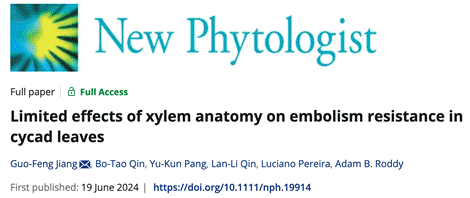 近日,公司蒋国凤科研团队在解析苏铁植物的栓塞抗性机制上取得重要进展,研究成果以“Limited effects of xylem anatomy on embolism resistance in cycad leaves”为题发表于植物学国际知名期刊New Phytologist (植物学类期刊排名11/238)。太阳成集团tyc122cc蒋国凤教授为论文第一和通讯作者,在读研究生覃伯韬,已毕业硕士生庞玉堃、覃兰丽,德国乌尔姆大学博士后Luciano Pereira,以及弗罗里达国际大学Adam B. Roddy助理教授参与了本论文工作。本研究主要得到了广西自然科学基金重点项目(2022GXNSFDA035059)等项目的支持。