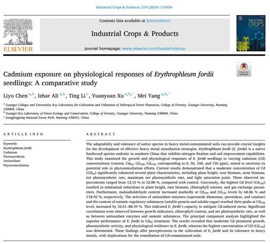 近日,公司杨梅教授科研团队在探究本地树种格木对重金属镉污染土壤的适应性和耐受性上取得重要见解,研究成果以“Cadmium exposure on physiological responses ofErythrophleum fordiiseedlings: A comparative study”为题发表于农林领域国际知名期刊INDUSTRIAL CROPS AND PRODUCTS(农林类期刊排名8/125)。太阳成集团tyc122cc在读硕士研究生陈丽宇作为第一作者,杨梅教授和徐圆圆讲师作为通讯作者,博士后Izhar Ali、良凤江国家森林公园李婷参与了本论文的工作。本研究得到了国家自然科学基金(32371856)等项目的支持。