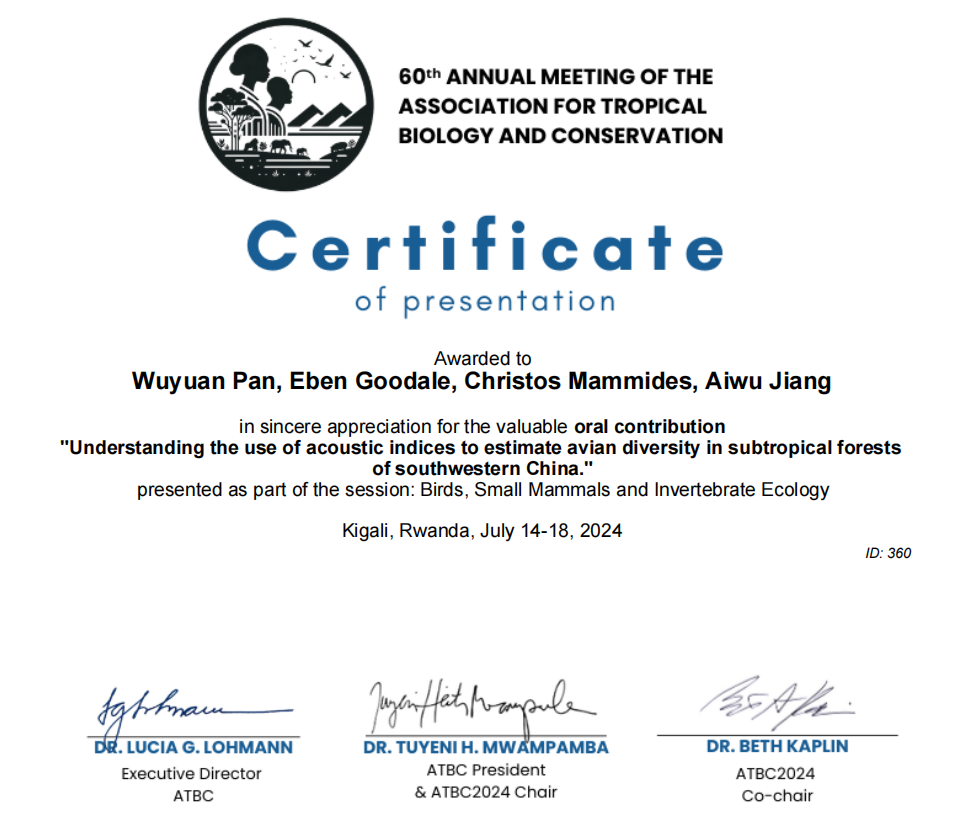 近日,公司博士研究生潘务远及蒋爱伍教授受邀参加热带生物学与保护协会2024年年会(60th Annual Meeting of the Association for Tropical Biology and Conservation,简称ATBC2024)。