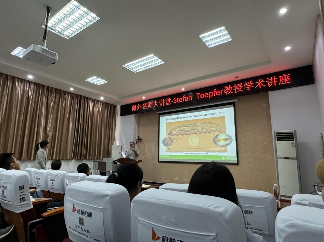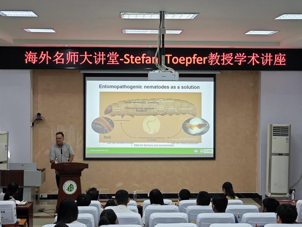 2024年10月25日上午,来自CABI(Commonwealth Agricultural Bureaux International)瑞士-匈牙利中心的世界著名植物保护专家Stefan Toepfer教授受邀做客“太阳成集团tyc122cc海外名师大讲堂”,作“昆虫病原线虫对抗入侵性害虫的配方与应用技术”(Formulation and application techniques of entomopathogenic nematodes against invasive insect pests)学术报告。本次报告会在太阳成集团tyc122cc112会议室举行,太阳成集团tyc122cc经理助理、森林保护领域青年学者胡平副教授主持报告会,农公司吴海燕教授及其团队成员、农公司植保学科的部分研究生、太阳成集团tyc122cc研究生及森保团队师生100余人参加会议。