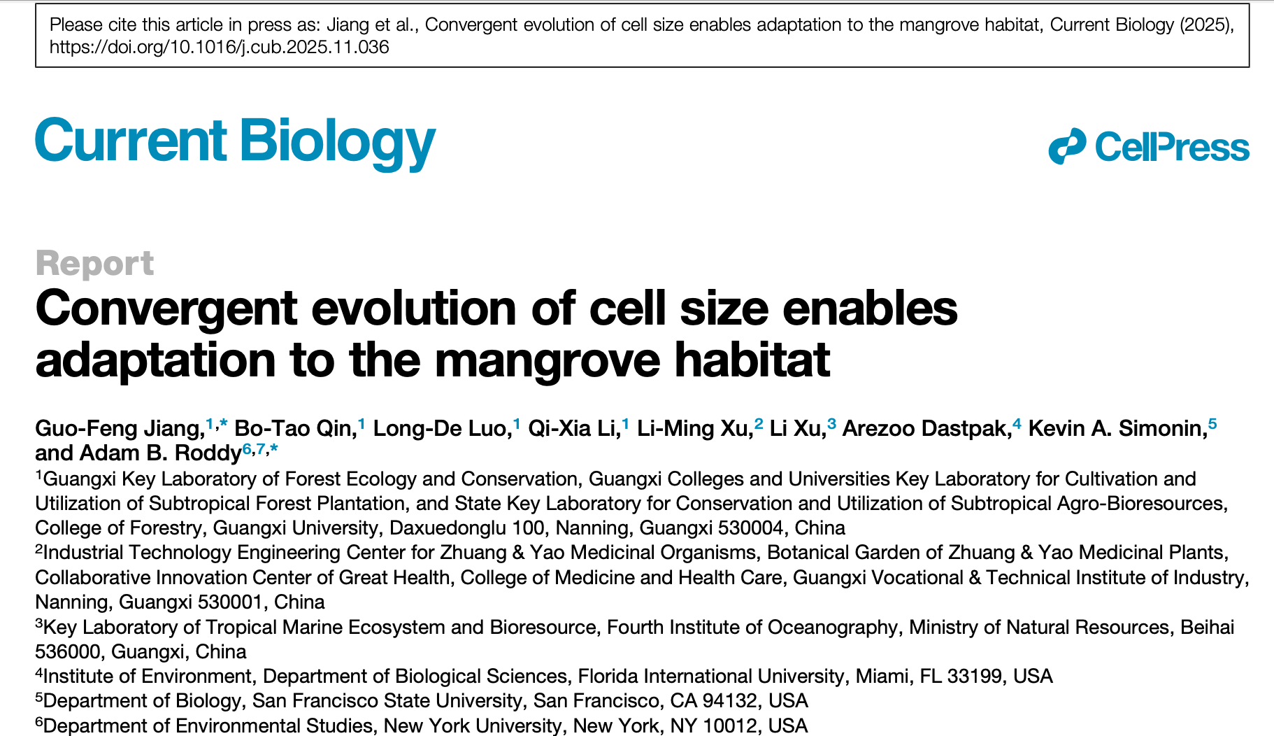 近日,太阳成集团tyc122cc作为第一完成单位,在植物适应性演化研究领域取得重要突破。由太阳成集团tyc122cc蒋国凤教授团队与国际合作者共同完成的研究论文《细胞大小的趋同演化助力红树植物生境适应》(Convergent evolution of cell size enables adaptation to the mangrove habitat)在生物学顶级期刊《Current Biology》上发表。该研究首次从细胞生物力学角度,系统揭示了红树植物适应高盐环境的细胞演化机制。