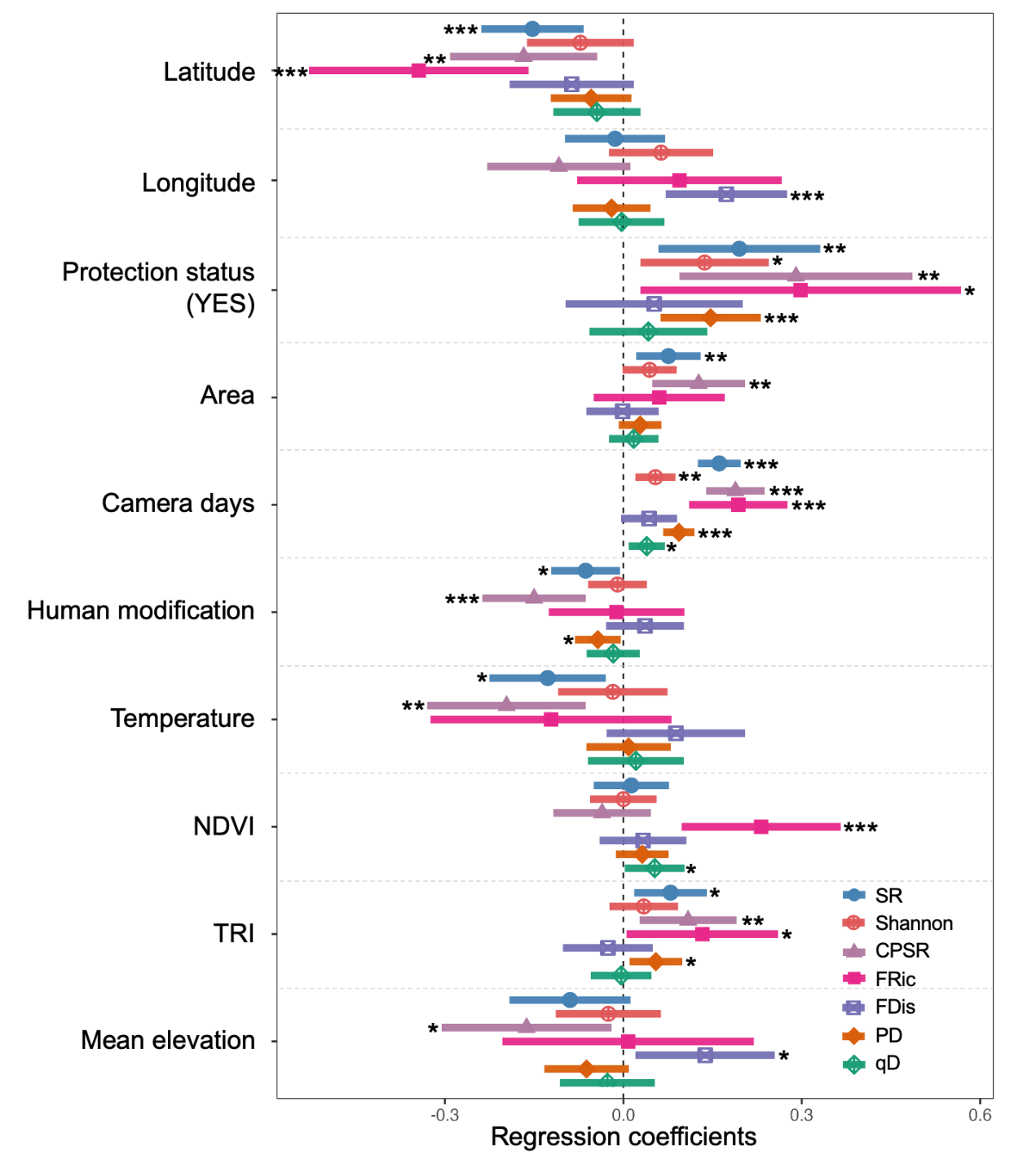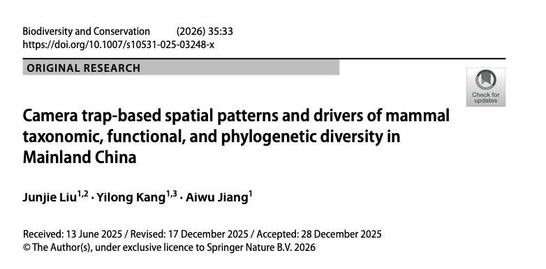 近日,公司蒋爱伍教授团队利用红外相机数据,在中国陆栖哺乳动物多维度多样性空间格局及其驱动因素方面取得新进展。该成果以“基于红外相机数据的中国大陆哺乳动物物种、功能和系统发育多样性格局”为题发表于生态保护领域经典期刊Biodiversity and Conservation(中国科公司二区,最新影响因子3.1)。太阳成集团tyc122cc2022级生态学博士生刘骏杰与2020级生态学专业本科生康怡珑(现为华东师范大学研究生)为共同第一作者,蒋爱伍教授为通讯作者。