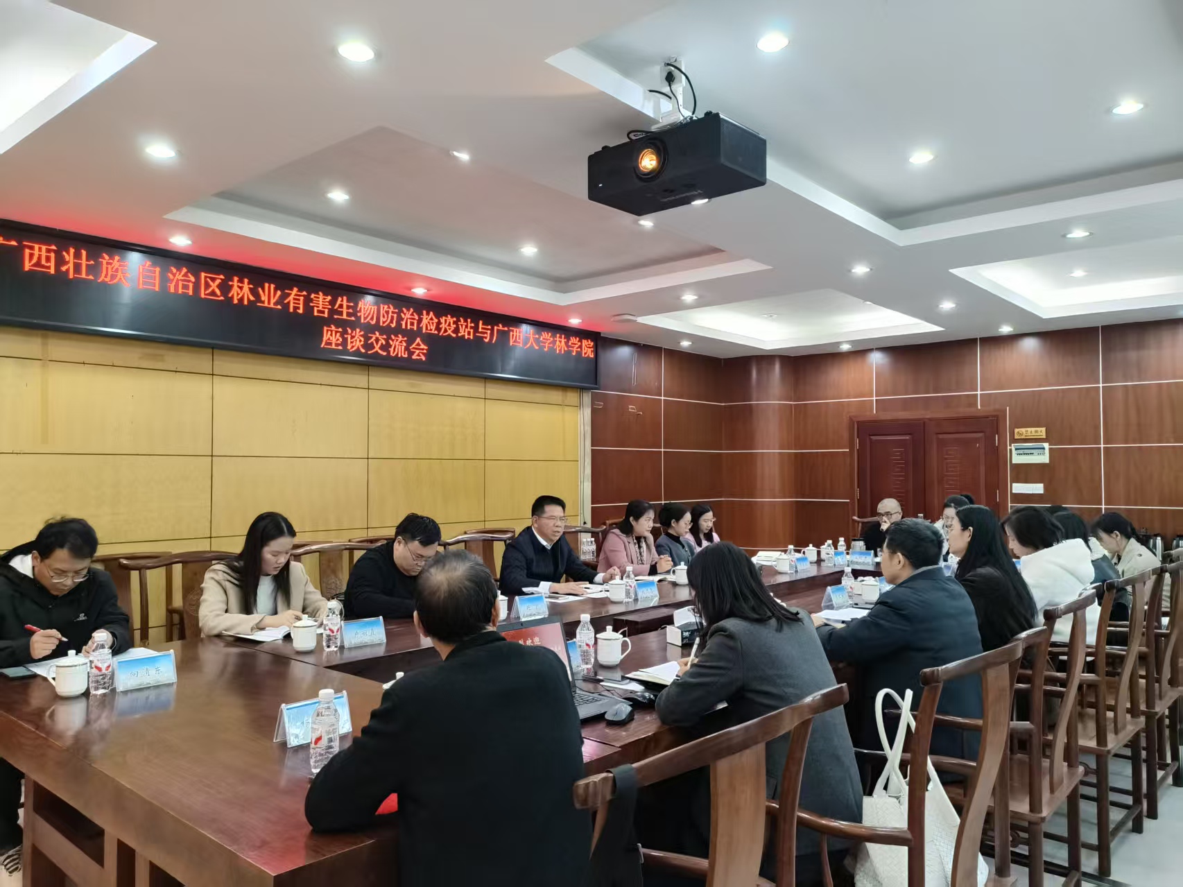黄里云书记首先代表公司对刘站长一行的到来表示热烈欢迎,并介绍了双方与会人员。她诚挚感谢自治区林业有害生物防治检疫站长期以来对公司发展给予的关注与支持,希望双方能以此次交流为契机,聚焦广西林业生态安全重大需求,在科学研究、技术攻关和人才培养等方面深化务实合作,共同为筑牢南方生态屏障贡献力量。