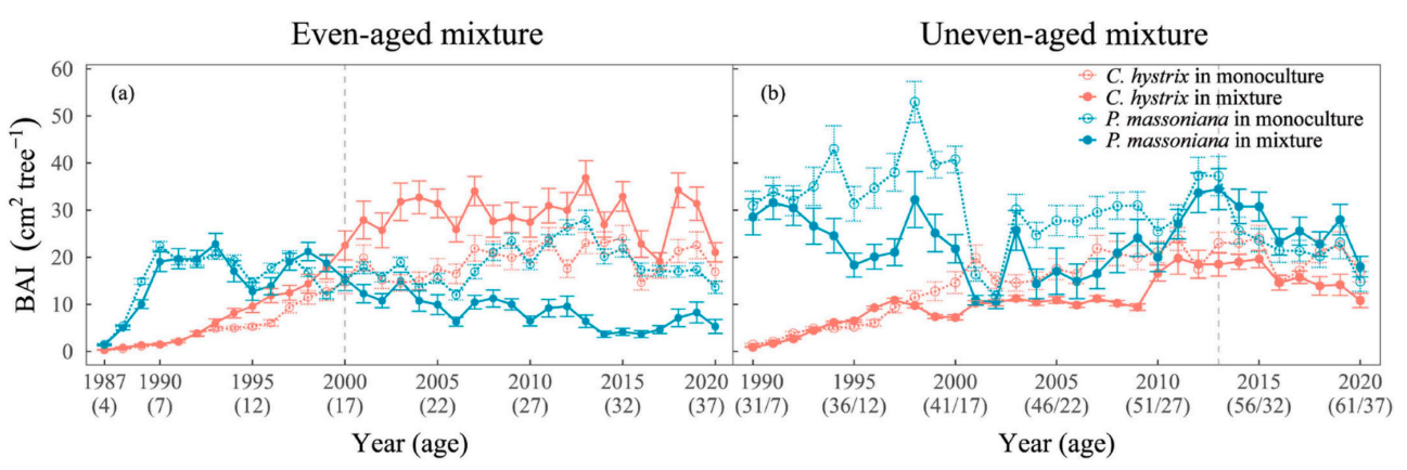 针对以上背景,该研究采用年轮学的方法,在个体水平(共286株树木)重建了马尾松(Pinus massoniana)和红锥(Castanopsis hystrix)组成的同龄混交林(EMs)和异龄混交林(UEMs)及其相应的纯林的37年生长序列。结果显示,在EMs中,马尾松的生长量较其纯林平均降低20.8%,而红锥则较纯林提高26.2%。然而,在混交的前17年内,马尾松的生长量并未受到显著影响,但在此之后则明显受到红锥的抑制。相较之下,在UEMs中,马尾松与红锥的生长量较其纯林均有所下降(分别降低20.8%26.2%),但随着混交时间延长,马尾松在混交30年后由受抑制转为受促进。此外,UEMs中马尾松的相对生长量随旱季降水量增加而提升。