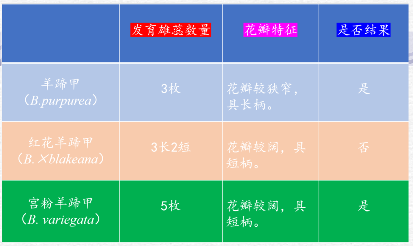 羊蹄甲、宫粉羊蹄甲和红花羊蹄甲均为我国南方常见栽培的观赏植物。这3种植物较为相似,不易区别,其主要分别为:羊蹄甲具能育雄蕊3枚,花瓣较狭窄,具长柄;而宫粉羊蹄甲有能育雄蕊5枚,红花羊蹄甲能育雄蕊3长2短,宫粉羊蹄甲和红花羊蹄甲花瓣较阔,具短柄。